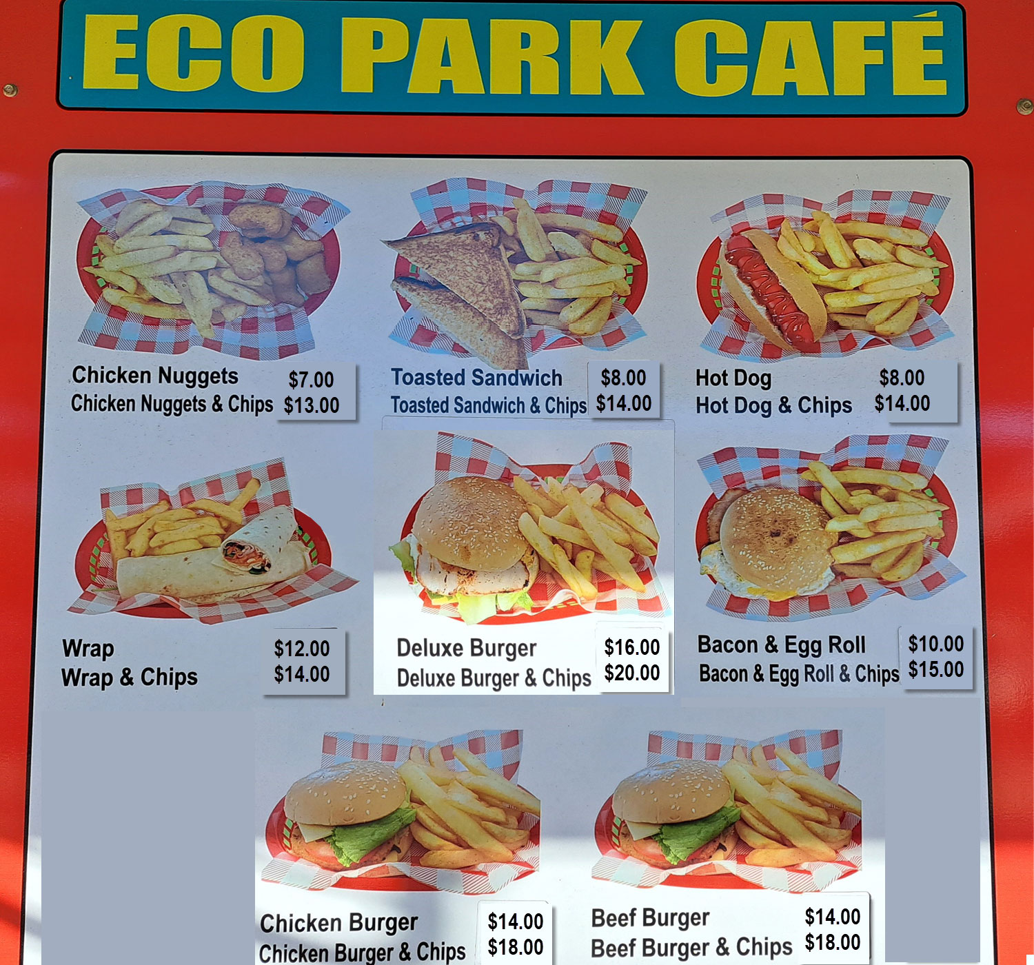 Beef or Chicken Burgers – Hot Chips – Chicken Nuggets – Chicken Schnitzel – Fish Fingers – Hot Dogs – Bacon Egg Cheese Muffin – Toasted Sandwiches – Wraps, Coffee, Tea, Cold Drinks, Fresh Ice cream in a cone or cups and a range of selected streets ice cream products